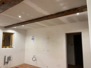- La pose de plaque de plâtre au plafond entre les poutres en bois existantes afin de réaliser un faux plafond